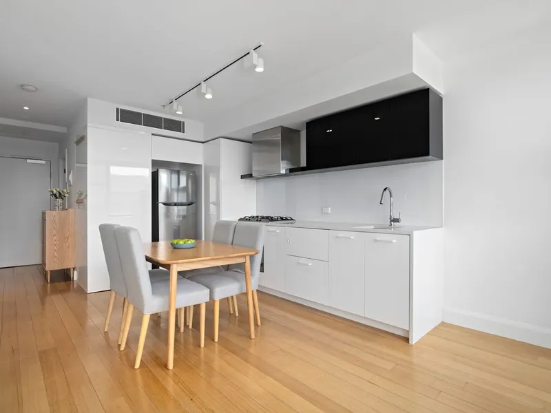 The spacious open-plan living and dining area features quality timber flooring and reverse-cycle heating and cooling for year-round comfort. Floor-to-ceiling windows fill the space with natural light and showcase stunning views of Melbourne’s city skyline. Step out onto the private undercover balcony, the perfect setting to relax or unwind while taking in the vibrant city surrounds.