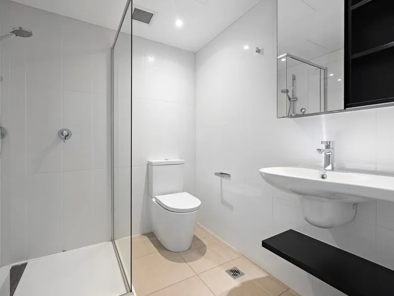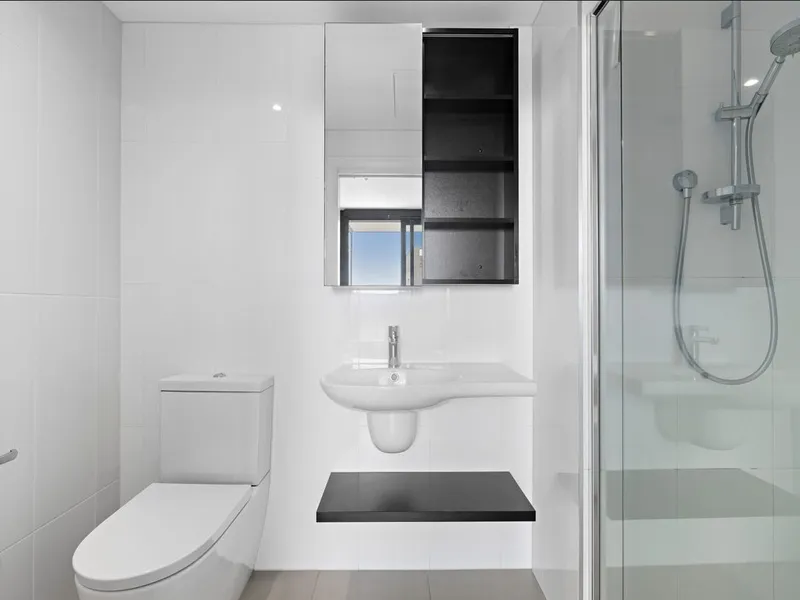 Both bedrooms are generously sized and include built-in robes, with the main bedroom enjoying direct balcony access and a private ensuite. The central bathroom is well-appointed with floor-to-ceiling tiles, a spacious shower, floating vanity and a discreet European laundry.