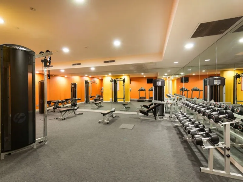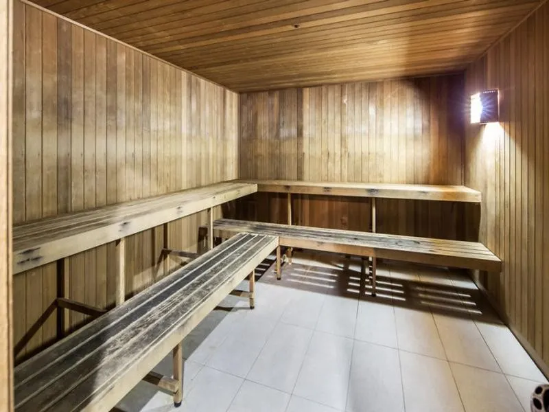 The building has a swimming pool, sauna, and a full-size gymnasium.