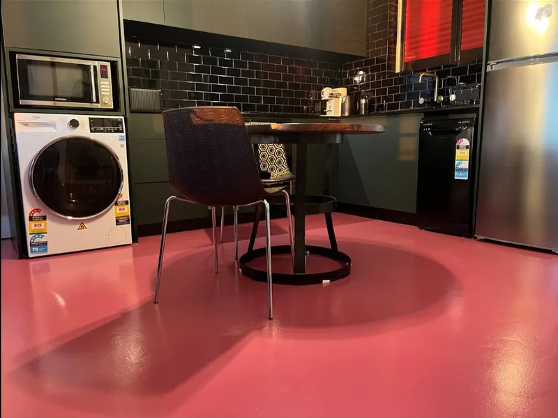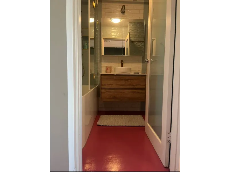 If you like a splash of colour here and there, you will be impressed by the mulberry coloured brand new polished concrete floors, renovated duck blue herringbone design bathroom with bath over shower and gold designed tapware with vanity. The apartment also features full length mirrored built in wardrobes with fold away New York style bed (ideal for when you want to fold it away and create additional space.)