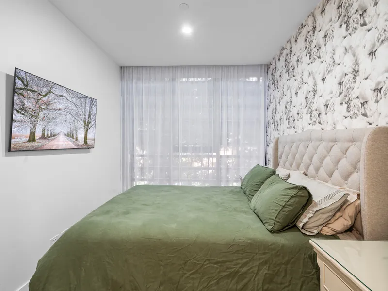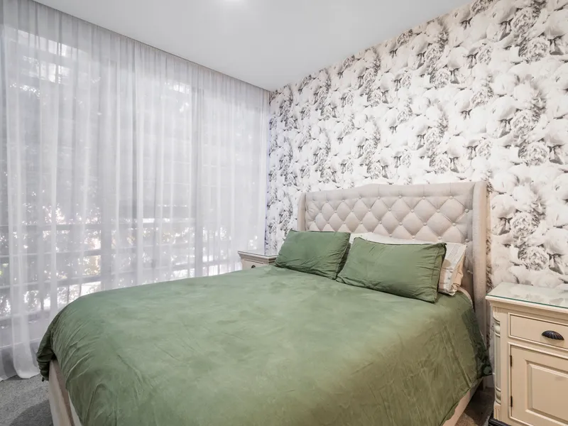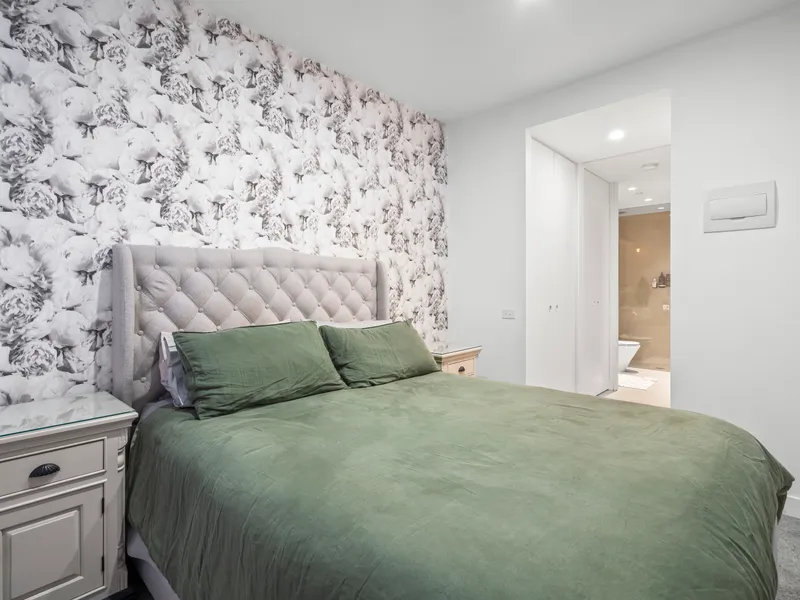 The apartment boasts a generous bedroom with sheer curtains and is equipped with built-in robes for ample storage. The contemporary kitchen is a chef's delight, featuring sleek stone benchtops, high-end European stainless steel appliances, an induction cooktop, fridge and a dishwasher, making meal preparation a pleasure.