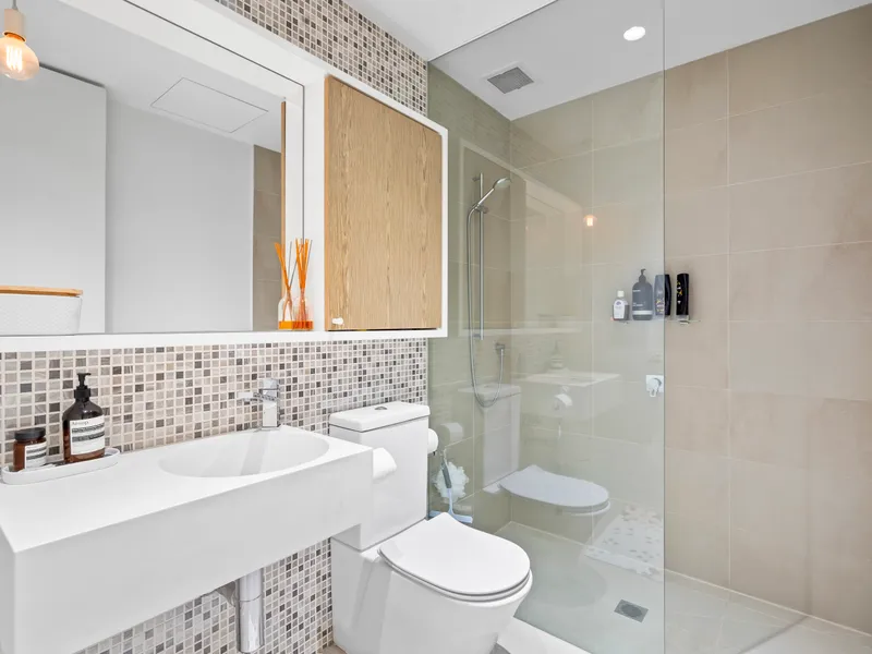 The modern bathroom is fitted with a large shower, offering a spa-like experience, and a separate European laundry with a washing machine included, adding convenience without compromising on space.