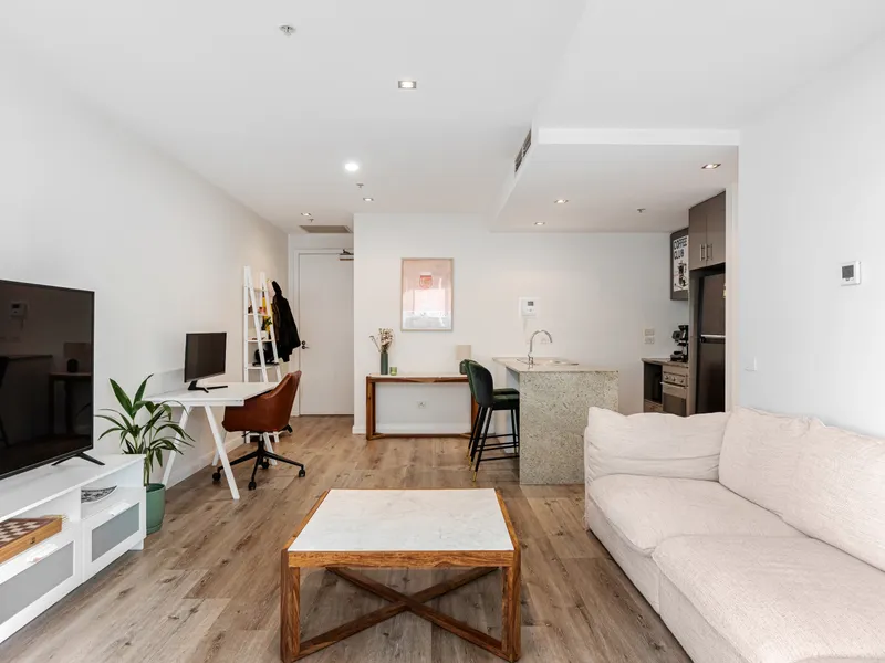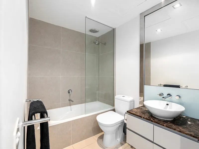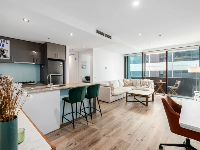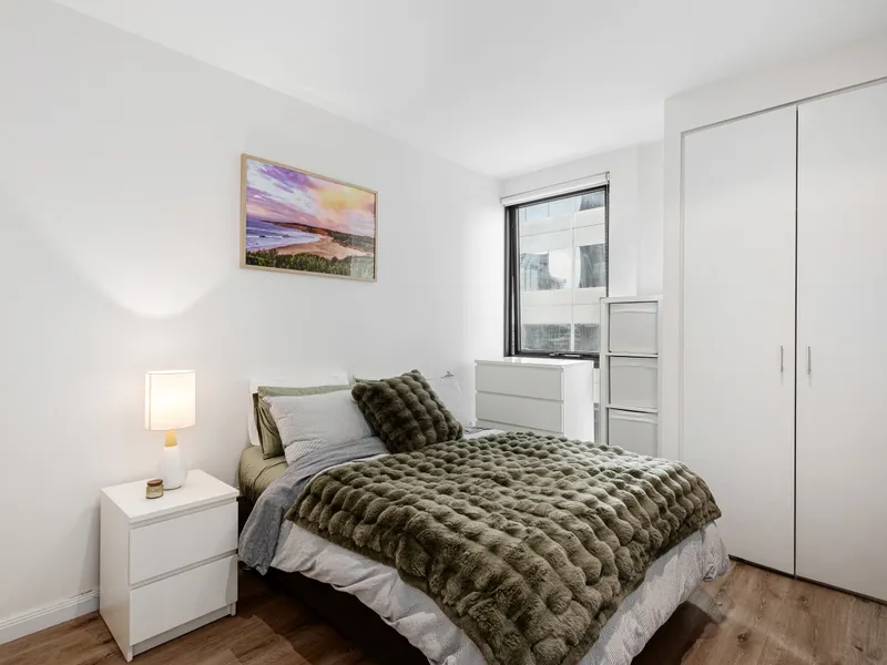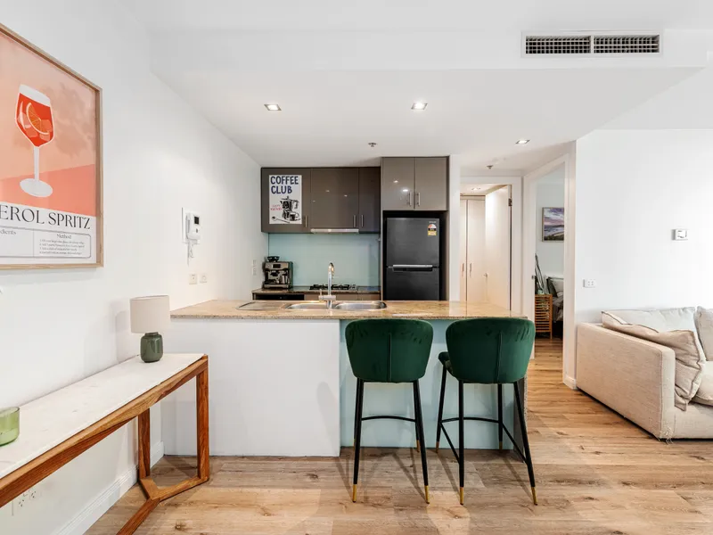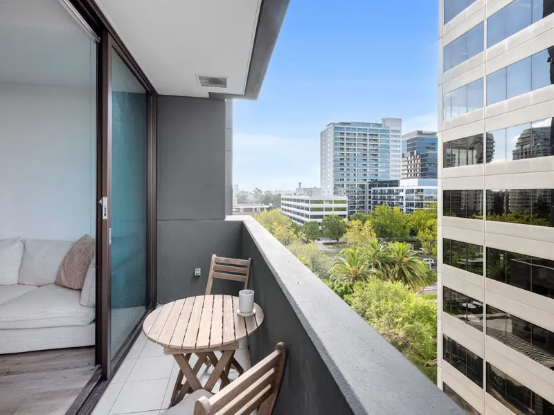 This stylish one-bedroom apartment in Melbourne’s landmark Metropolis complex combines luxury, comfort and an unbeatable location. Positioned on the 5th floor, the residence features an open-plan living and dining area that flows out to a balcony, a granite-bench kitchen equipped with Smeg stainless steel appliances, a bedroom with built-in robes, and a sleek central bathroom. Additional highlights include ducted heating and cooling, a European laundry, video security entry, secure foyer access and a dedicated car space.