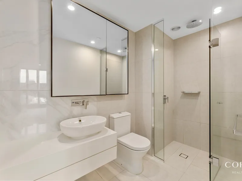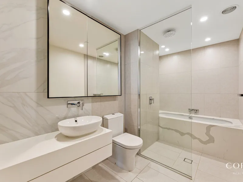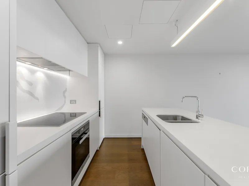 Stunning open plan living and dining areas are overlooked by an accommodating kitchen equipped with top Miele appliances and ample storage. Floor-to-ceiling windows invite the outdoors into the spacious open plan living space, with a semi-enclosed balcony ideal for relaxing.