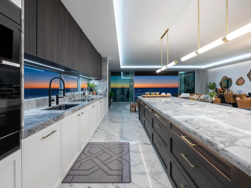 -Bookmatched Calacatta marble floors, soaring ceilings, LED lighting, Sonos system, and full home automation