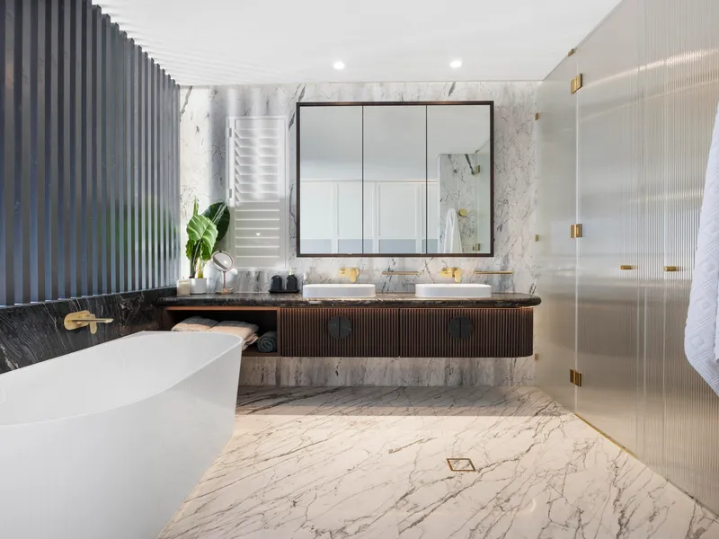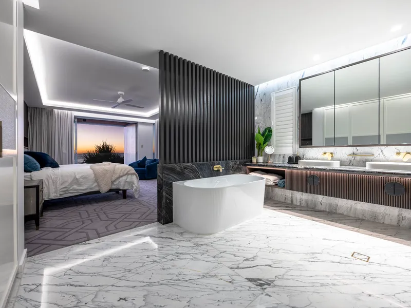 The master suite offers a serene beachfront retreat reminiscent of a private hotel suite. It features a wraparound robe, an opulent ensuite with freestanding bath, and a secluded balcony – perfect for morning coffee or afternoon sea breezes. Each additional bedroom is equally well-appointed with its own ensuite, completing the home’s refined and functional layout.