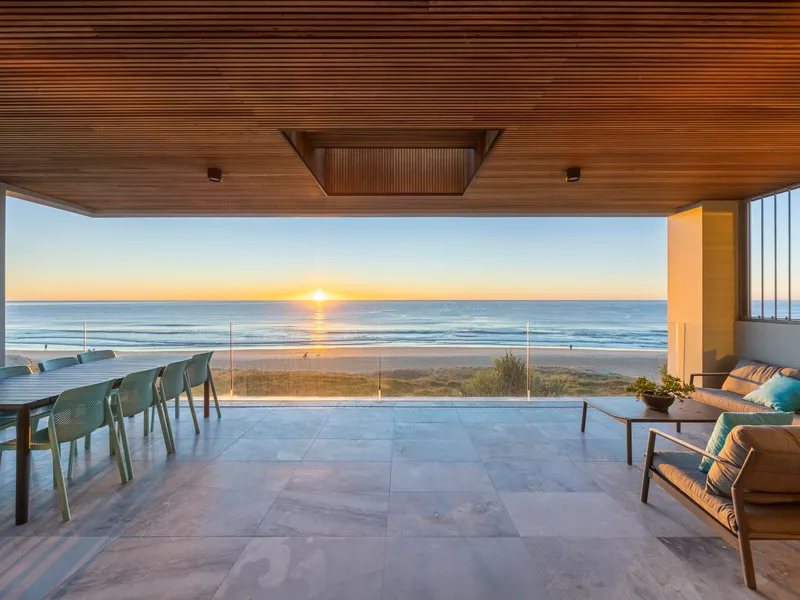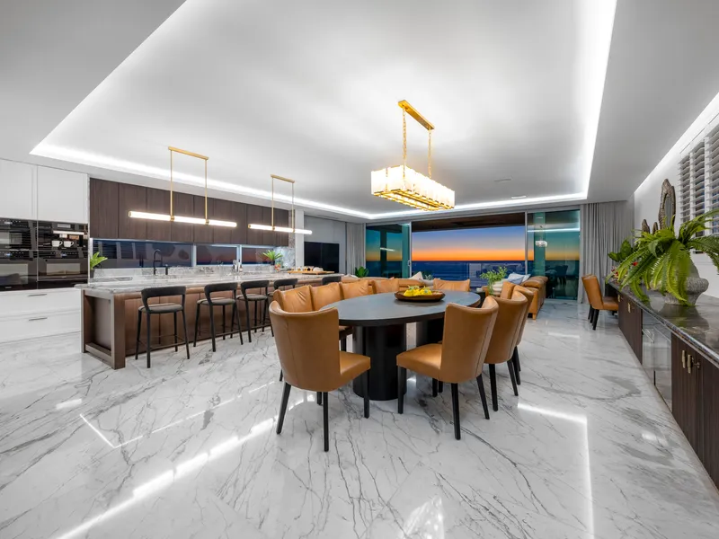 Inside, soaring coffered ceilings, rich natural materials, and premium finishes create a sense of quiet grandeur and timeless elegance. The expansive open-plan living and dining zone is framed by floor-to-ceiling glass, drawing the ocean into every moment.