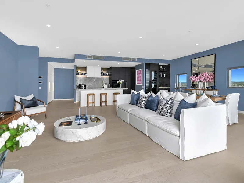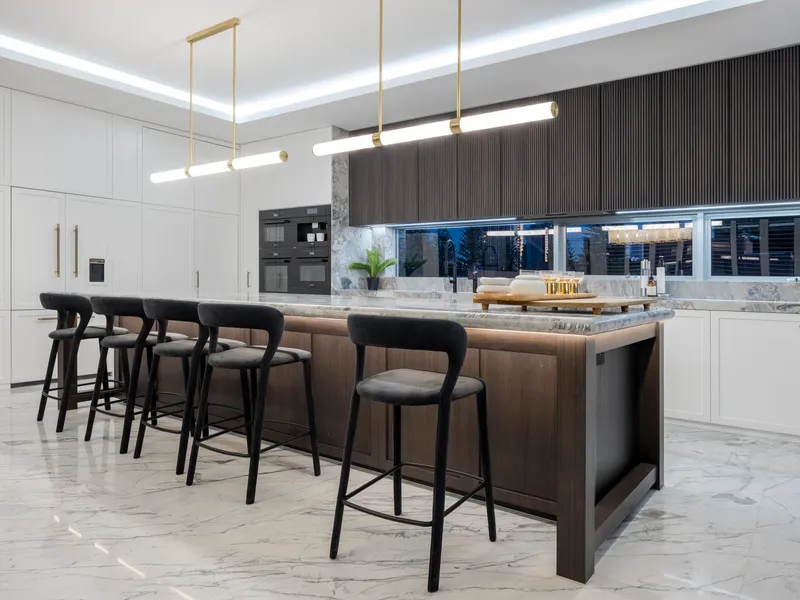 A luxury gourmet kitchen anchors the space, featuring a grand island bench and a suite of seamlessly integrated Miele appliances, dual Smeg wine fridges, and Zip Tap, delivering a premium culinary experience reserved for the most sophisticated kitchens.