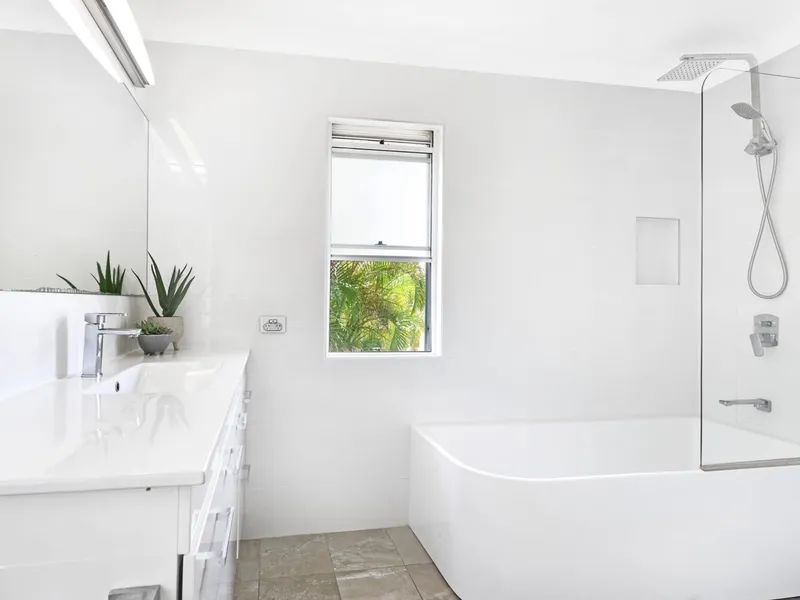The open plan living and dining area creates a bright and welcoming central hub, filled with natural light and enhanced by ceiling fans for year round comfort. The modern kitchen is well appointed with sleek stone benchtops, a dishwasher and practical storage, making it ideal for both everyday living and entertaining.