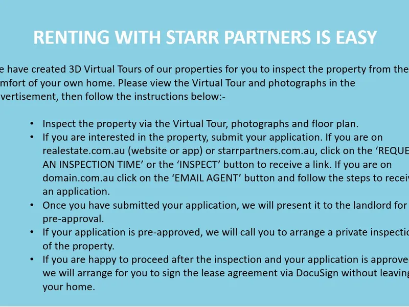 If you are interested in the property, submit your application. If you are on realestate.com.au (website or app) or starrpartners.com.au, click on ‘REQUEST A TIME, ‘REQUEST INSPECTION’ or ‘INSPECT’ button to receive a link. If you are on Domain.com.au click on the ‘EMAIL AGENT’ button and follow the steps to receive an application.