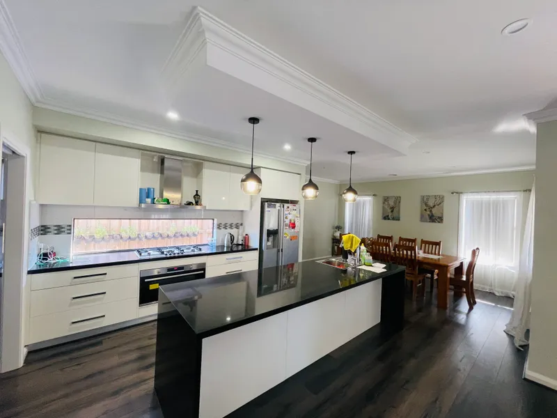 At the heart of the home is a huge open plan kitchen, meals, and living area designed for modern living. The contemporary kitchen is equipped with top-of-the-range 600mm stainless steel appliances, including a dishwasher, ensuring both style and practicality. The living area seamlessly flows out to a low-maintenance, fully landscaped backyard complete with a clothesline - perfect for relaxed outdoor living.