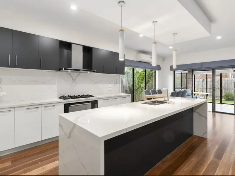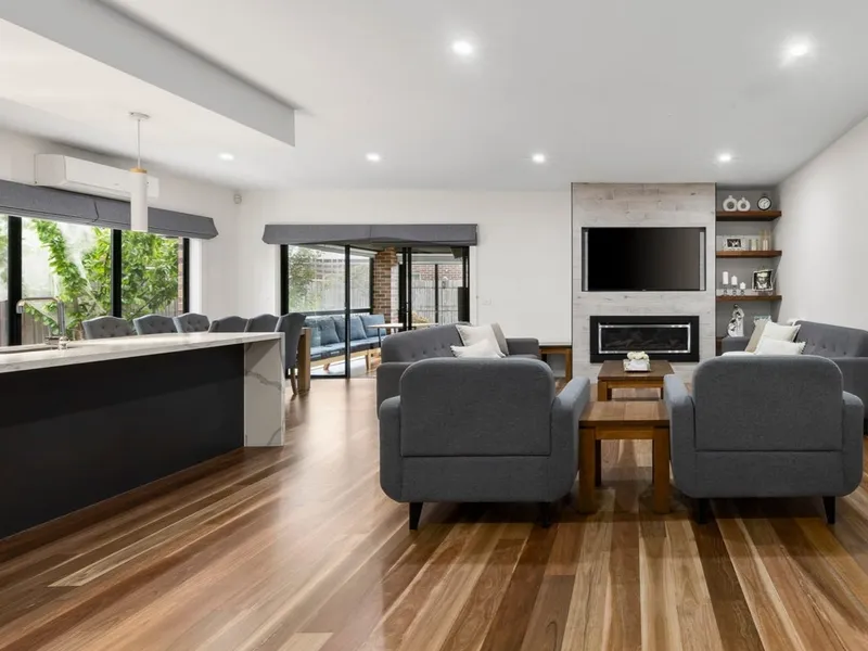 The heart of the home is the contemporary kitchen featuring a large stone island bench, quality appliances, and a walk-in pantry. An additional kitchen in the enclosed alfresco area makes entertaining easy all year round. The main living space is warm and welcoming with a gas fireplace, while the separate theatre room is perfect for movie nights or extra accommodation.