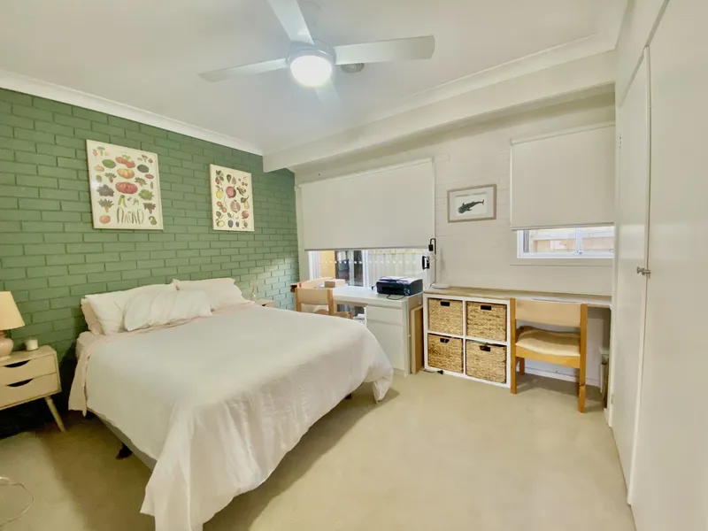 The master bedroom includes a ceiling fan, built-in wardrobe, and private ensuite featuring a large open shower and toilet. The second bedroom offers a ceiling fan and built-in wardrobe, while the third bedroom/guest room also includes a built-in wardrobe and ceiling fan.