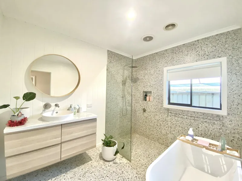 The newly renovated main bathroom features a large open shower and bath, with a separate toilet for added convenience.