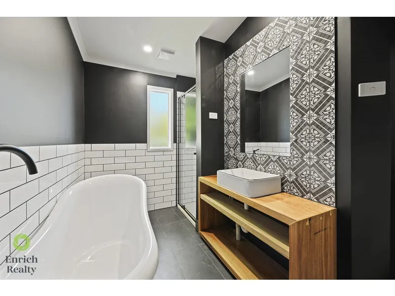 The stylish main bathroom is fitted with contemporary finishes, complementing the home’s fresh and modern appeal.