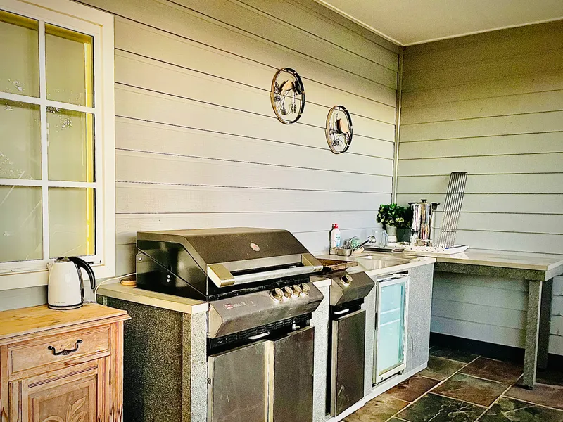 1. Covered Alfresco - Flowing from the main living area, this all-weather terrace includes: 12-seater dining table, BBQ, outdoor kitchenette & bar fridge, Wine barrels & timber bench seating