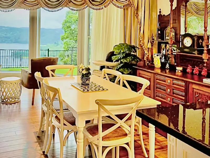 Master Retreat: Tranquil, eastern-inspired suite with ensuite and lake views. (Note: adjacent to internal stairs accessed by the owners for upstairs — light footstep noise may be audible.)