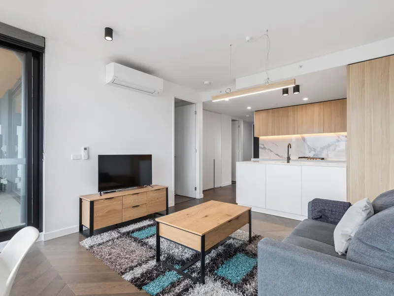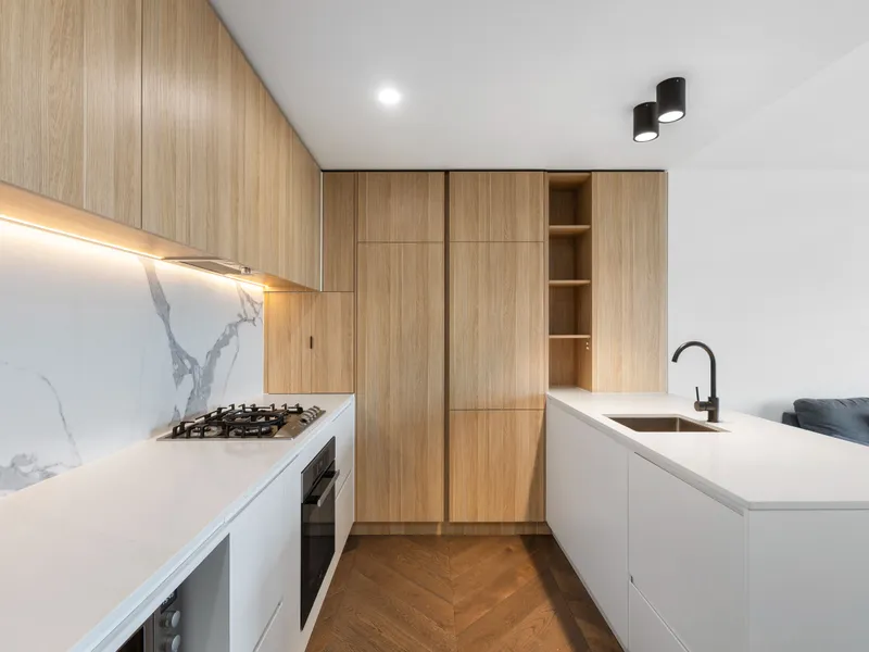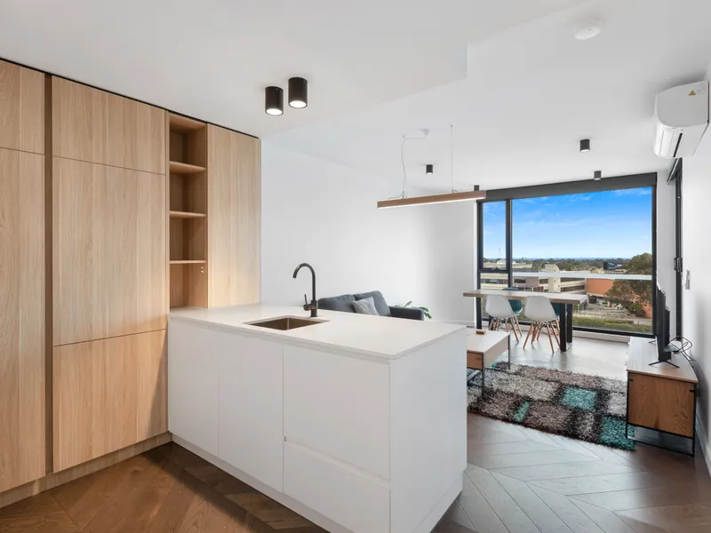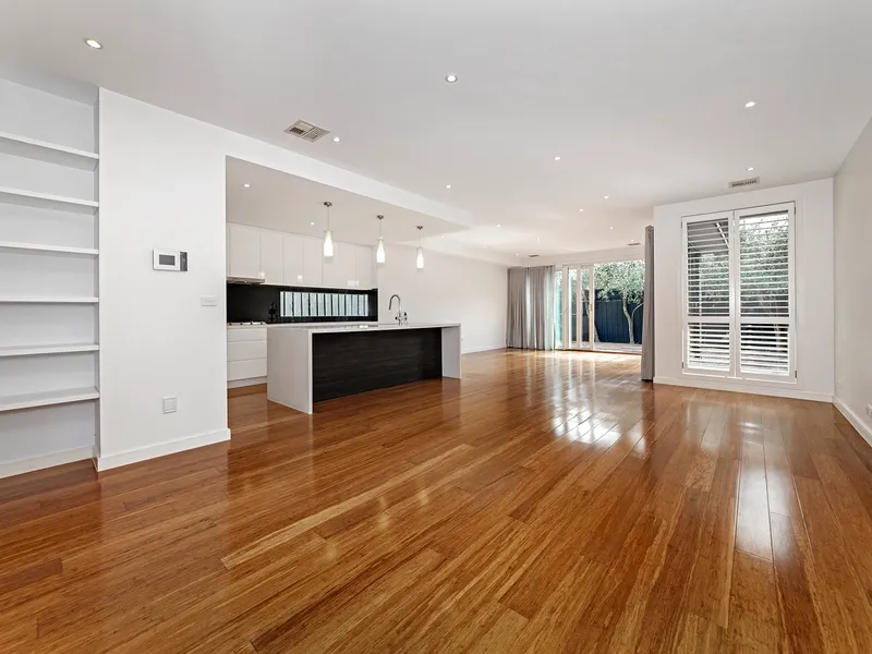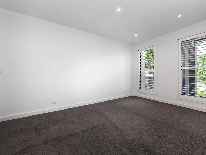 Downstairs includes a spacious main bedroom suite complete with Japanese-style sliding doors, a fitted walk-in robe, and a stylish ensuite. The heart of the home is the expansive north-facing open-plan living and entertaining area, complemented by a sleek stone kitchen with Smeg stainless steel appliances, Bosch dishwasher, and walk-in pantry. A powder room and well-appointed laundry complete the lower level.