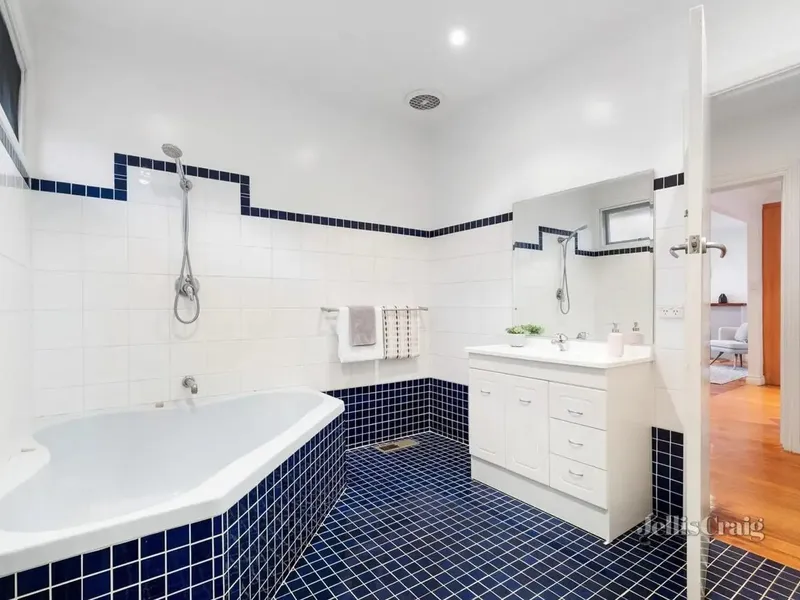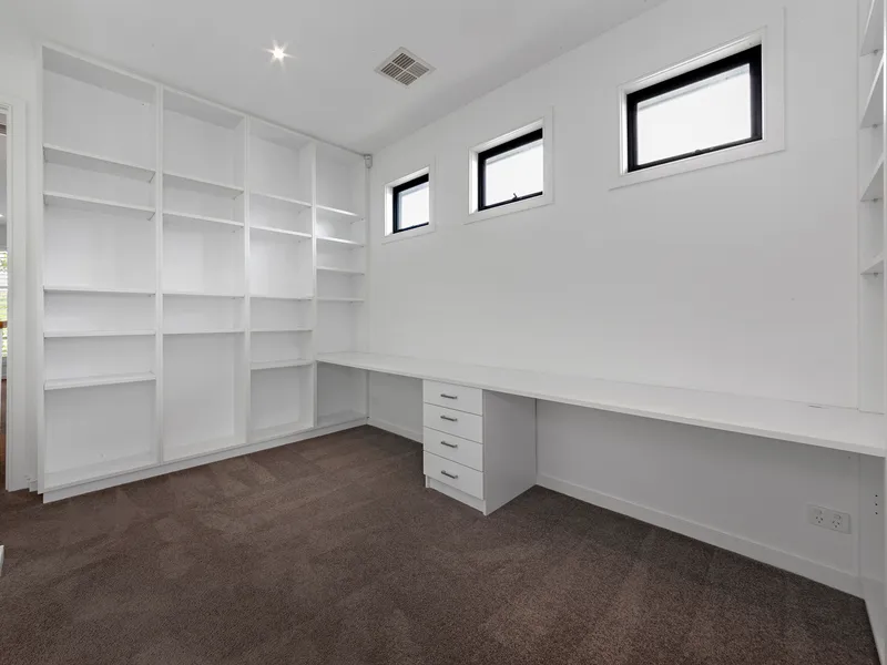 Upstairs, natural light fills the staircase via a striking lightwell. This level offers a second bedroom suite with walk-in robe and ensuite, a study landing, two additional double bedrooms with built-in robes, and a beautifully designed bathroom featuring a freestanding bath.