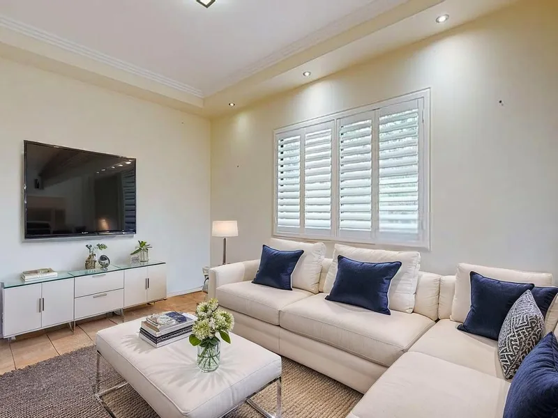 The contemporary kitchen is equipped with quality appliances, ample storage and a dishwasher, while air conditioning and ceiling fans provide year-round comfort.