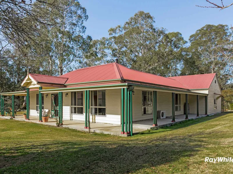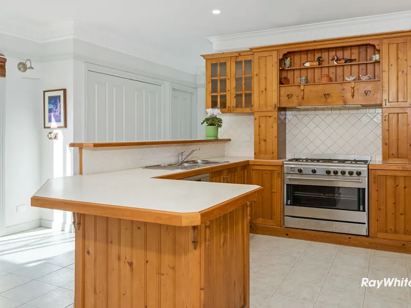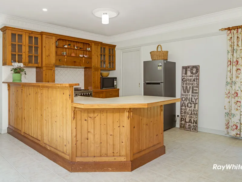 The home features a warm country style kitchen with walkin pantry, sunlit open-plan living, and a wraparound veranda capturing beautiful mountain sunsets. Year- round comfort is assured with a slow combustion fireplace, ceiling fans, and air conditioning.