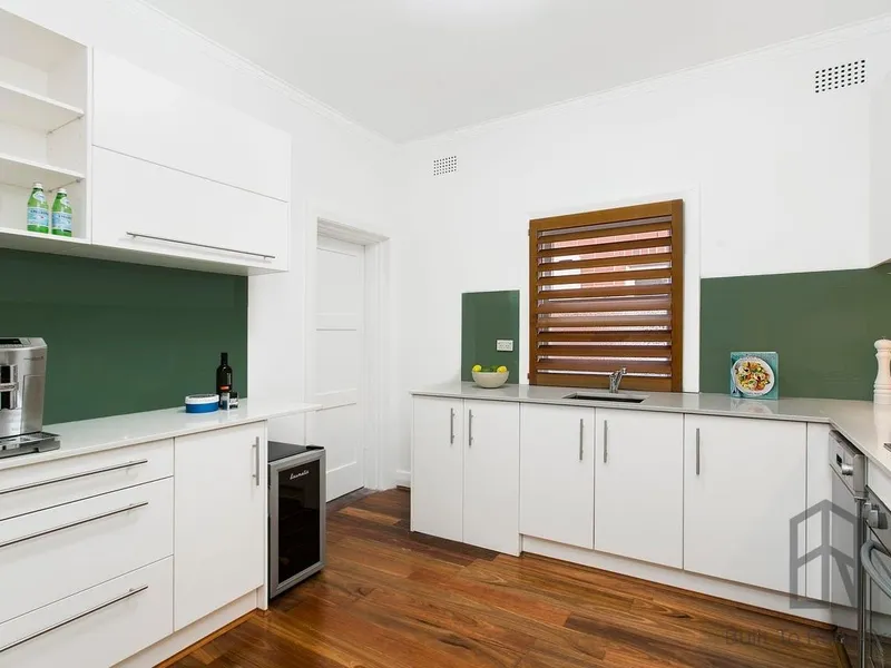 *Modern Caesarstone and gas kitchen with stainless steel appliances, dishwasher, glass splash back and room for causal breakfast table