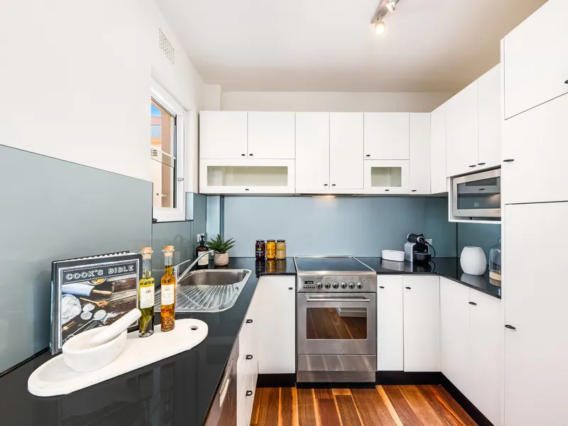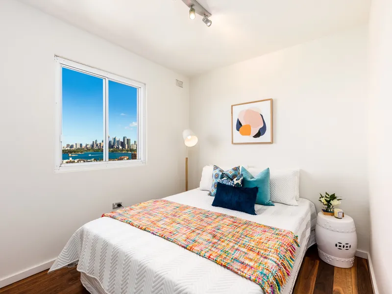 Picture postcard vistas across Sydney's iconic harbour and skyline are revealed from every room in this exceptional top floor apartment. Wrapping around the corner of stylish 'Curraghbeena', it boasts sixth floor elevation which showcases vast expanses of crystalline water, the eastern suburbs and the CBD in all its glory.