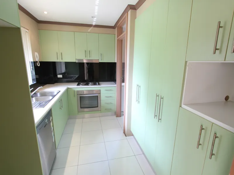 • L-shaped kitchen with electric cook-top, rangehood, oven and dishwasher