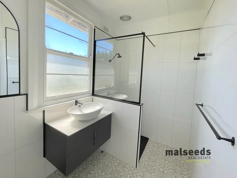 The generous sized bathroom is beautifully finished with a large walk-in shower, a floating vanity and crisp white wall tiles. The adjacent laundry with mud room area is also modern and stylish. There is a sunroom at the rear of the home, perfect for extra living space or a home office or study.