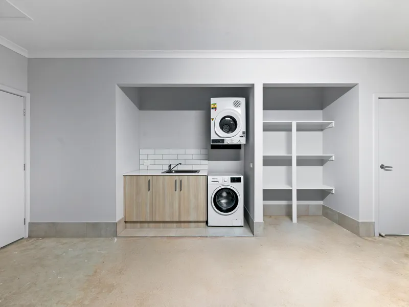 – Concreted low-maintenance backyard with secure fencing and clothesline