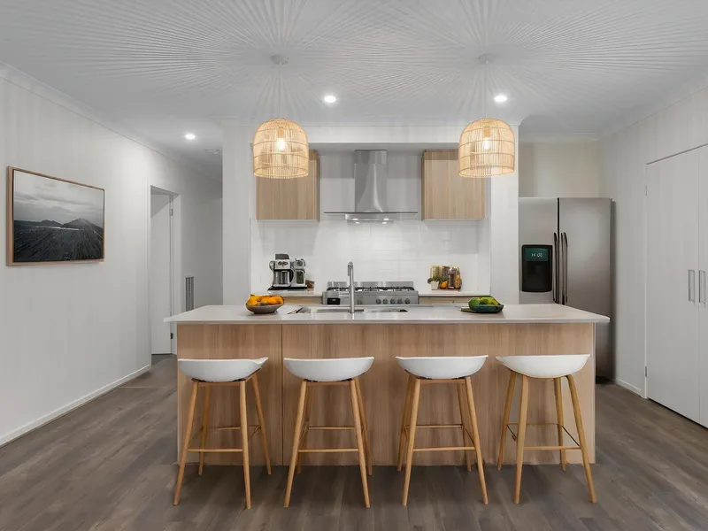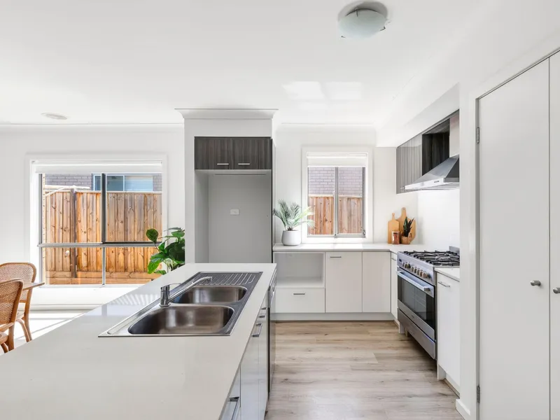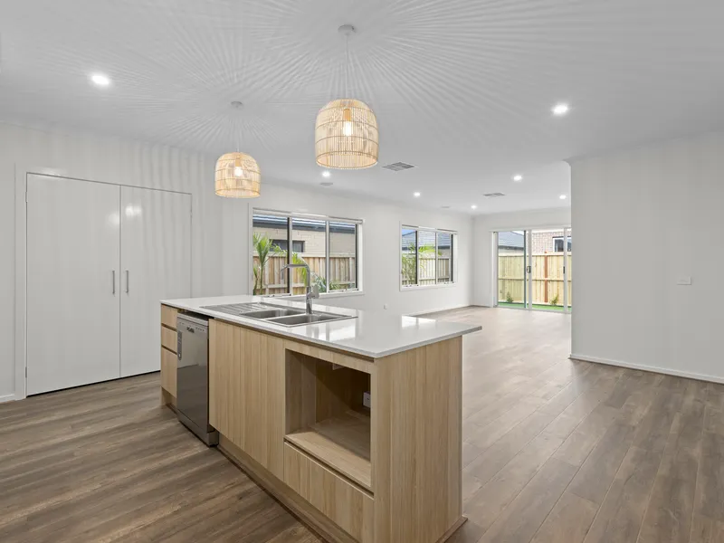 At the heart of the home, you’ll find an expansive and light-filled open-plan kitchen, living, and dining area that provides the perfect setting for both everyday living and entertaining. The kitchen is designed with the home chef in mind, featuring a 5-burner gas cooktop, a 600mm oven, a dishwasher, and abundant cupboard space. Stunning stone benchtops complete the space, offering both style and practicality.