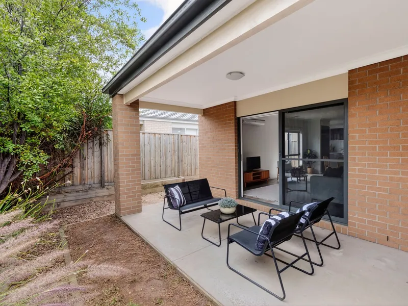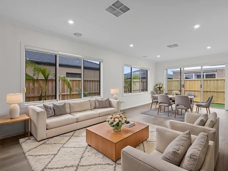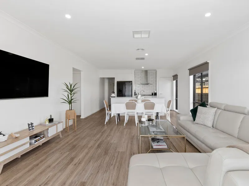 The living and dining zones flow effortlessly to the undercover alfresco area, creating a seamless connection between indoor and outdoor living. The spacious backyard is fully fenced, providing plenty of room for children or pets to play safely, while the surrounding concrete paths ensure easy access around the property.