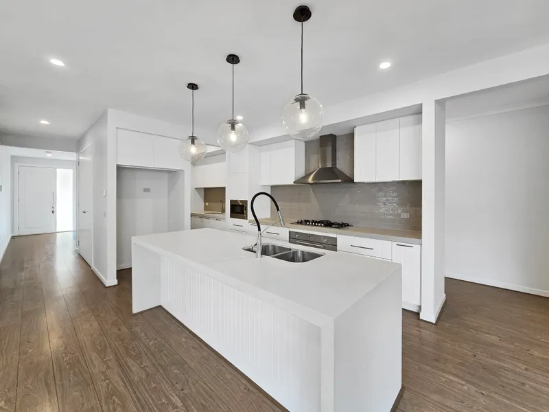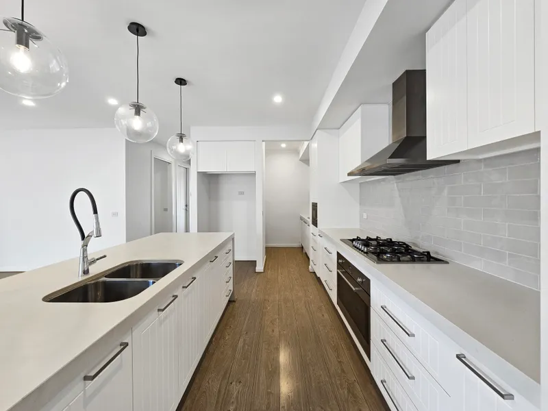 - Modern designer kitchen with 900mm stainless steel appliances, in-built microwave, dishwasher, stone bench tops, pendant lights and butlers pantry
