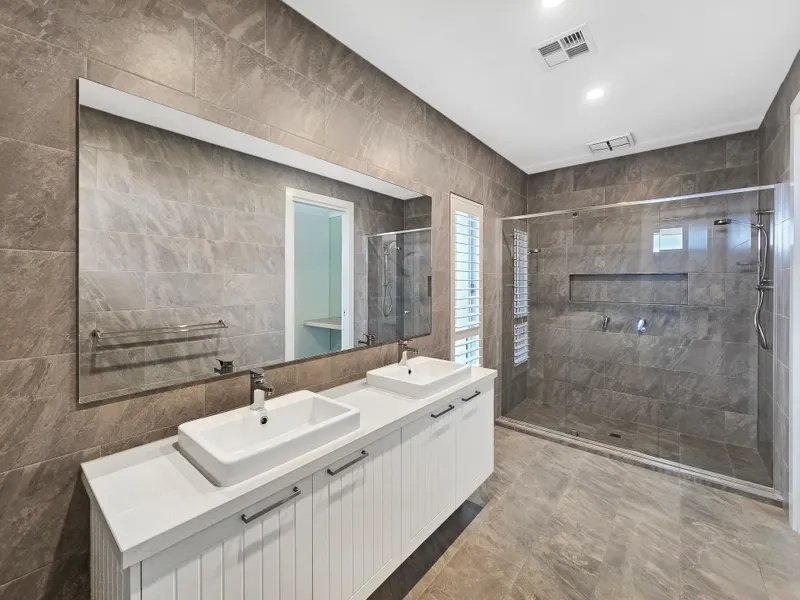 - Four spacious bedrooms (master bedroom with walk in robe, dressing room with mirrored wall, and ensuite with twin vanity and shower, stone bench top and floor to ceiling tiles, three further bedrooms with mirrored built in robes)
