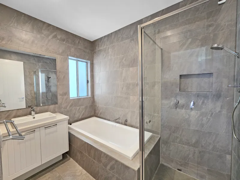 - Family bathroom is complete with floor to ceiling tiles, stone bench top, shower, bath & separate powder room