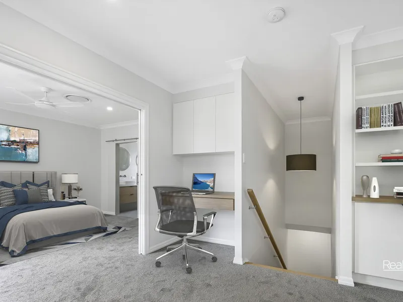 - Four generously sized bedrooms with built-in wardrobes and ducted air conditioning throughout. The master suite upstairs features an ensuite with dual vanities, a walk-in robe, a cozy living area, a Juliette balcony, and a study nook.