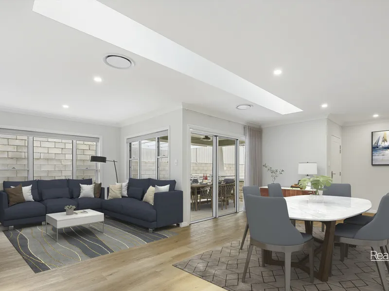 - A bright dining and living area that seamlessly connects to a spacious outdoor alfresco area through sliding stacker doors.