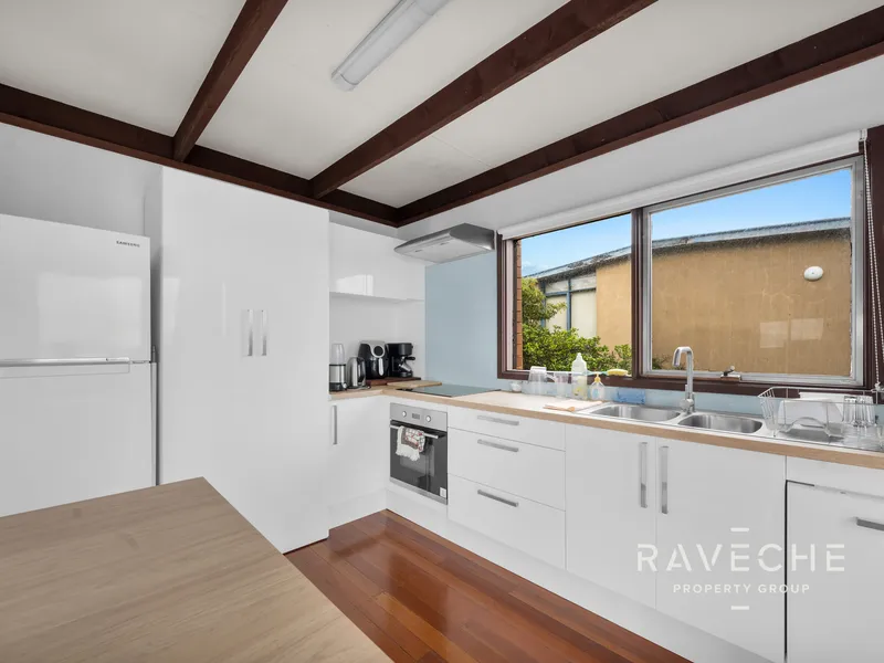 Open plan kitchen, lounge and dining room, kitchen with dishwasher, ample storage and stunning floorboards.