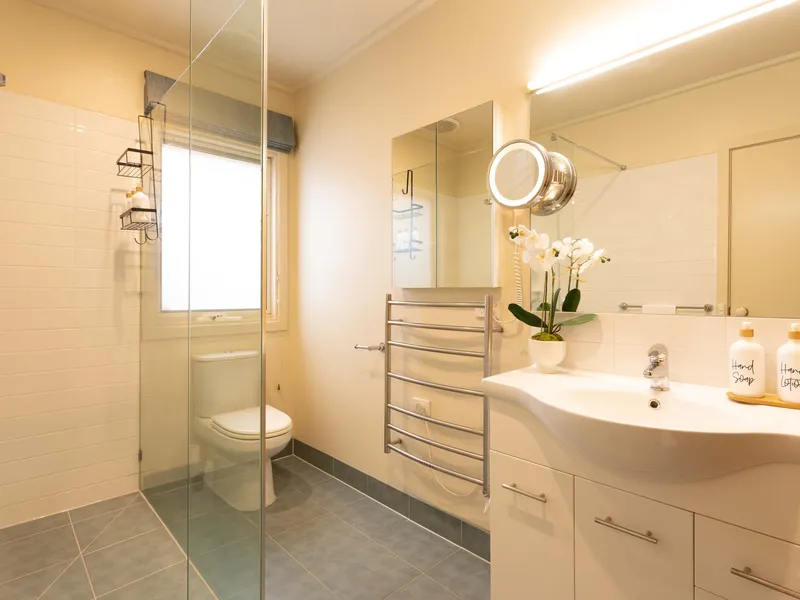 The luxurious master suite provides a peaceful retreat, with its own walk-in robe, a modern ensuite complete with an infrared sauna, and tranquil garden views that enhance the sense of privacy. Two additional well-sized bedrooms, each with built-in robes, share a beautifully appointed family bathroom, offering comfort and functionality for all.