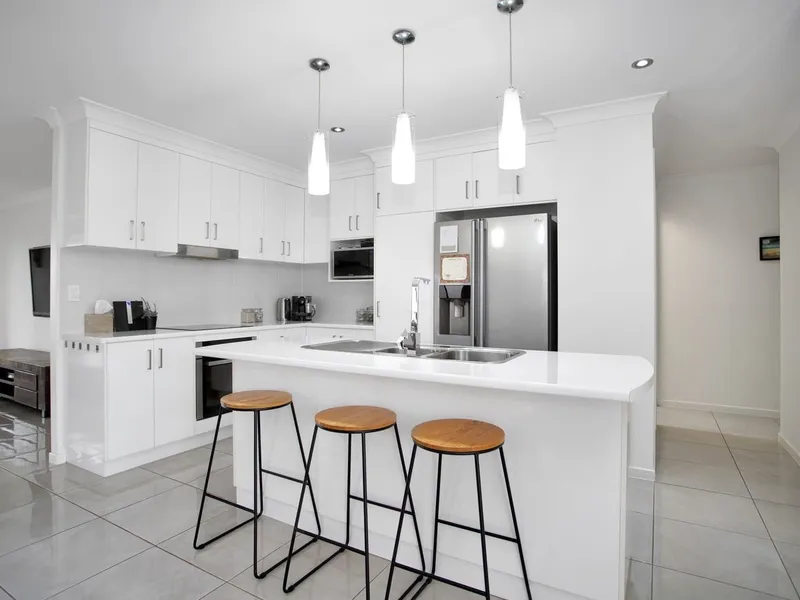- Designer kitchen with island bench, electric cooktop and dishwasher.