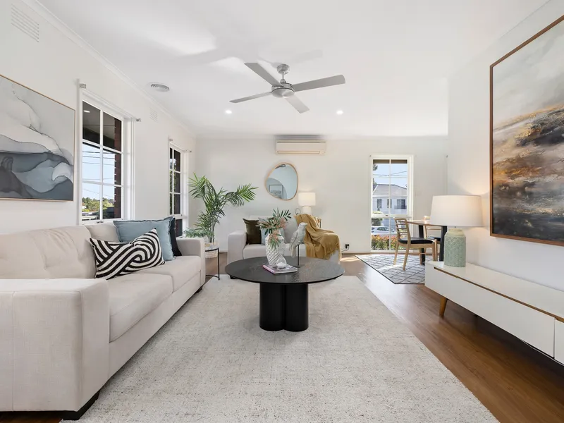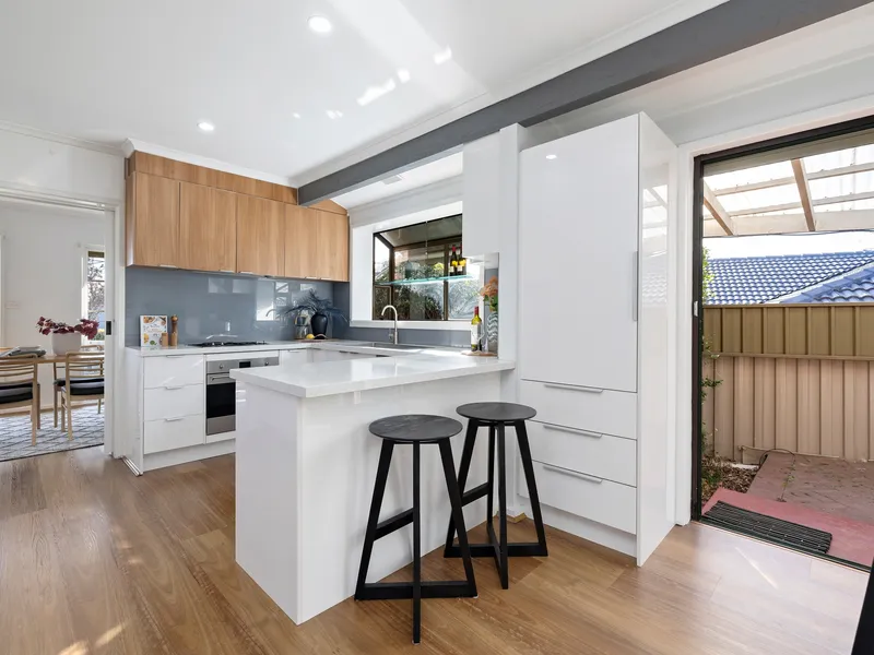 Downstairs boasts a spacious light filled two separate living areas, open plan kitchen with Smeg stainless steel gas cooktop, electric oven, dishwasher plus walk in pantry with plenty of cupboard and storage space. The garage space has been converted to home office/study.