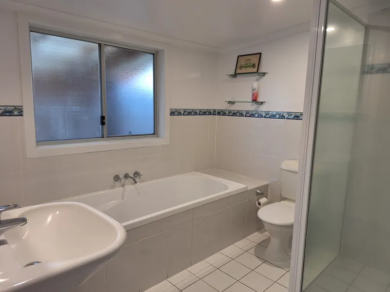 Large second bedroom with Queen size bed, drawers built in robes and air conditioning