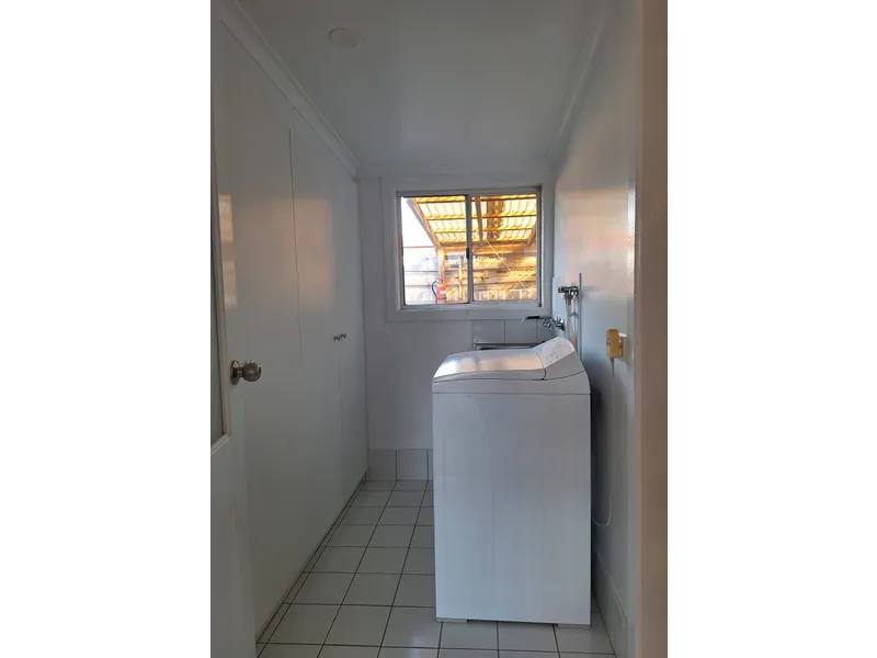 Laundry with linen cupboard, trough and top loader washing machine