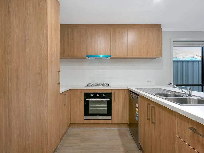 The well appointed kitchen will impress anyone who enjoys cooking, featuring sleek laminate benchtops, breakfast bar seating, gas cooktop, electric oven, built-in pantry, and quality Euro appliances.