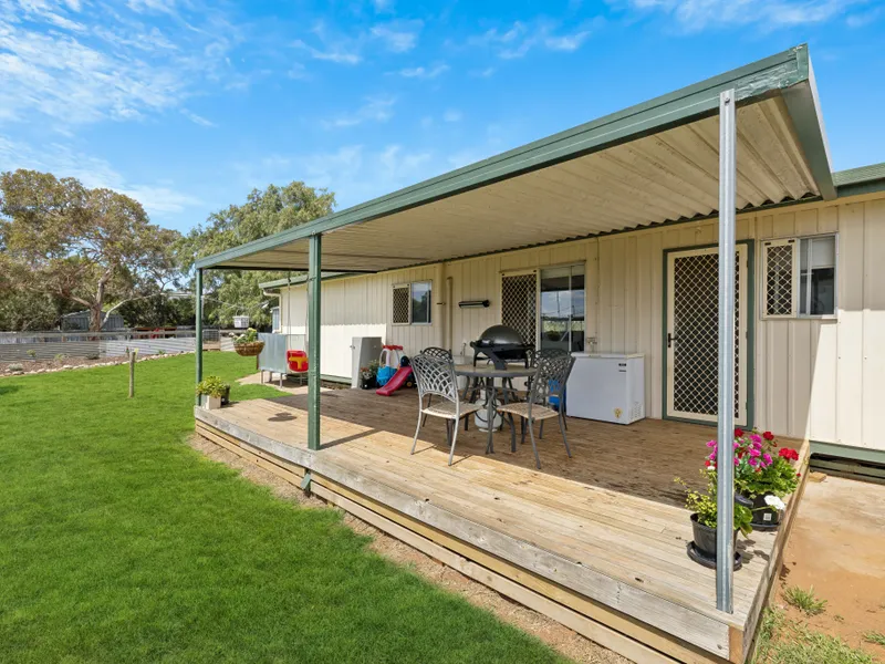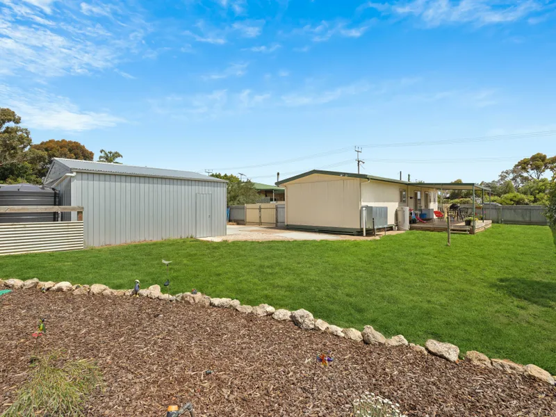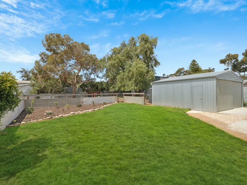 Step outside, and the home offers a spacious undercover patio area, ideal for outdoor use throughout the year. The surrounding lawns and established gardens provide plenty of space to enjoy, while a large chook yard at the rear adds a unique and practical feature. A substantial concreted shed to the side of the home offers excellent storage or workspace options, along with additional outdoor features including rainwater tanks and a decked verandah.