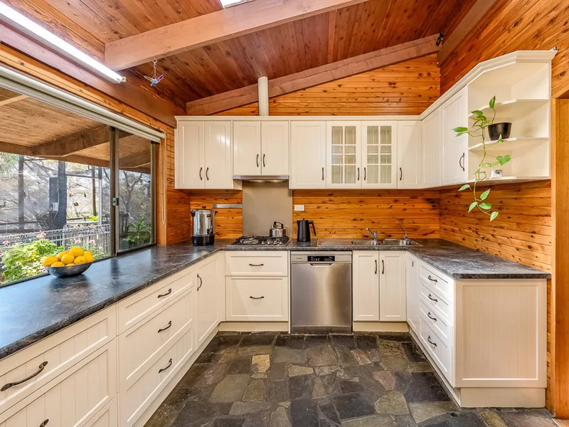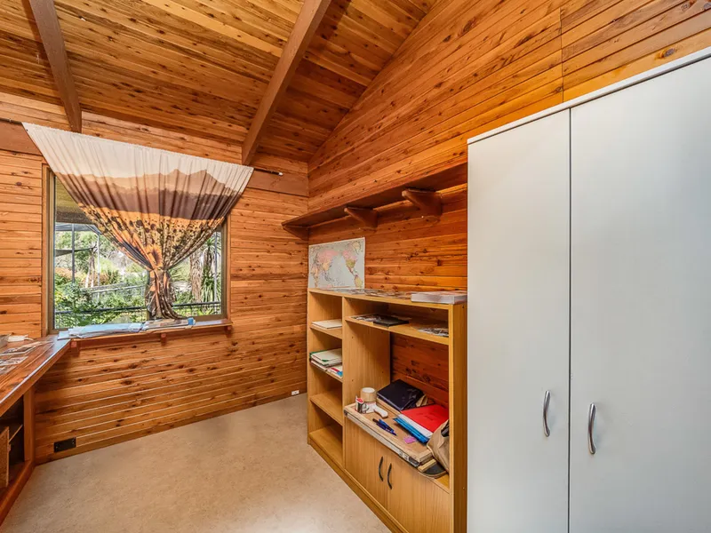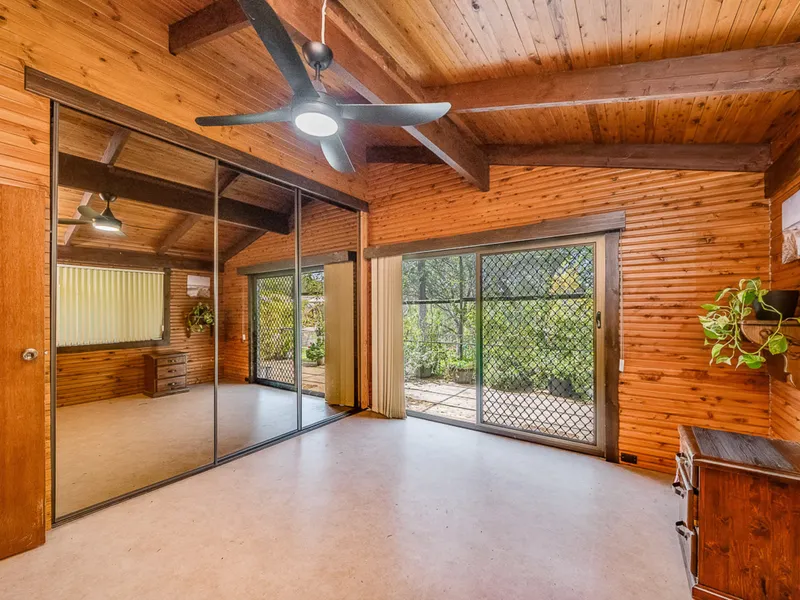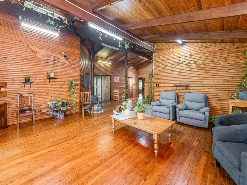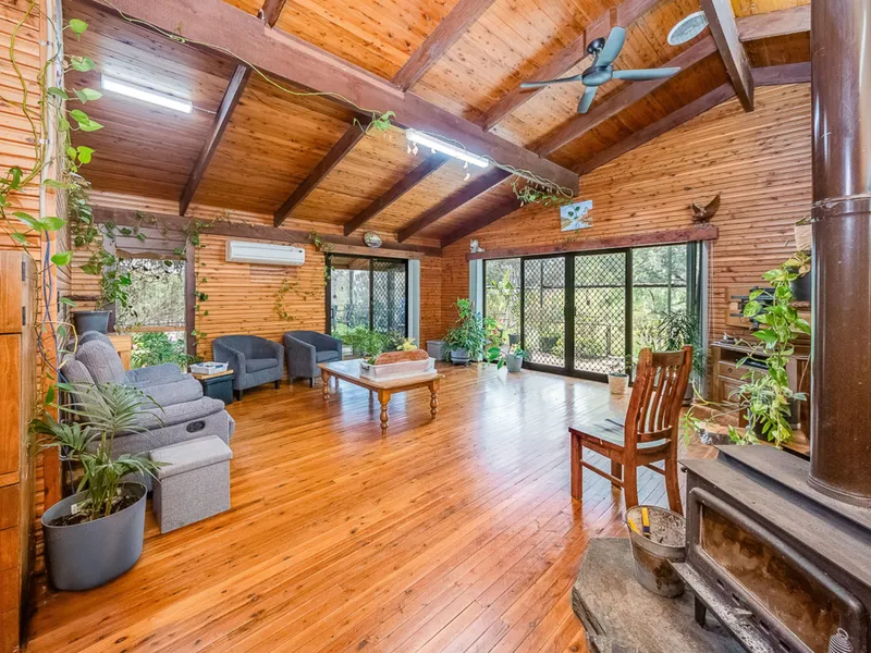 The home includes three to four bedrooms, making it suitable for families or those needing extra room to work from home. The property features established gardens and multiple fenced areas, ideal for pets, chickens, or small livestock.
