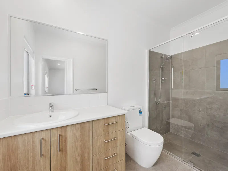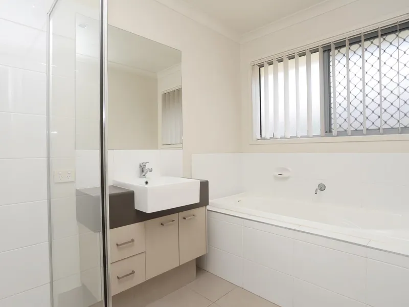 Upstairs offers three well-sized bedrooms. The master includes a walk-in robe and private ensuite, while Bedrooms 2 and 3 feature built-in wardrobes and are serviced by a modern main bathroom with separate bath and shower. Neutral tones, ceiling fans, air-conditioning, and quality finishes throughout create a fresh, low-maintenance home ready to enjoy.