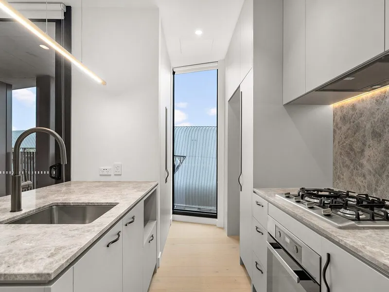 Step inside to a bright, open-plan living and dining area framed by floor-to-ceiling windows, flowing seamlessly to a private balcony—perfect for morning coffee or relaxed evenings. At the heart of the home is a sleek stone island bench with a feature pendant light, anchoring a designer kitchen complete with Miele gas cooktop, oven, and rangehood, plus an integrated Fisher & Paykel dishwasher.