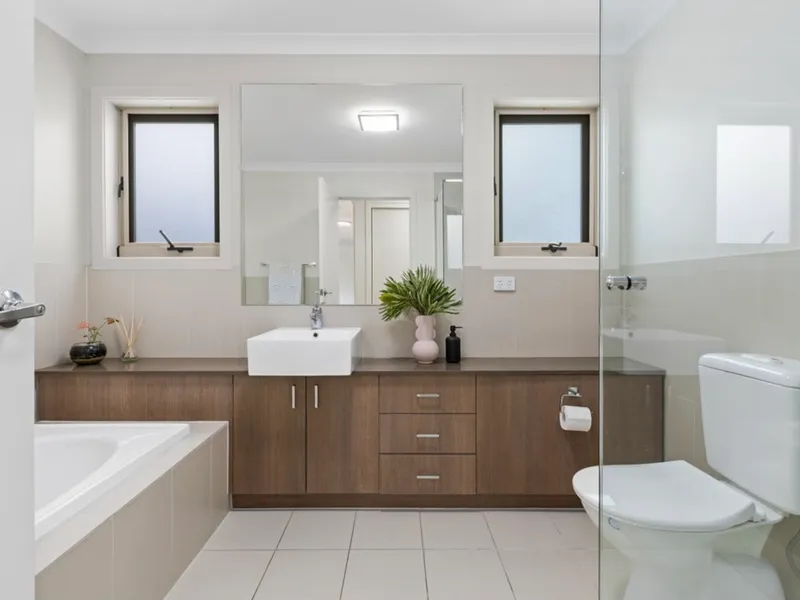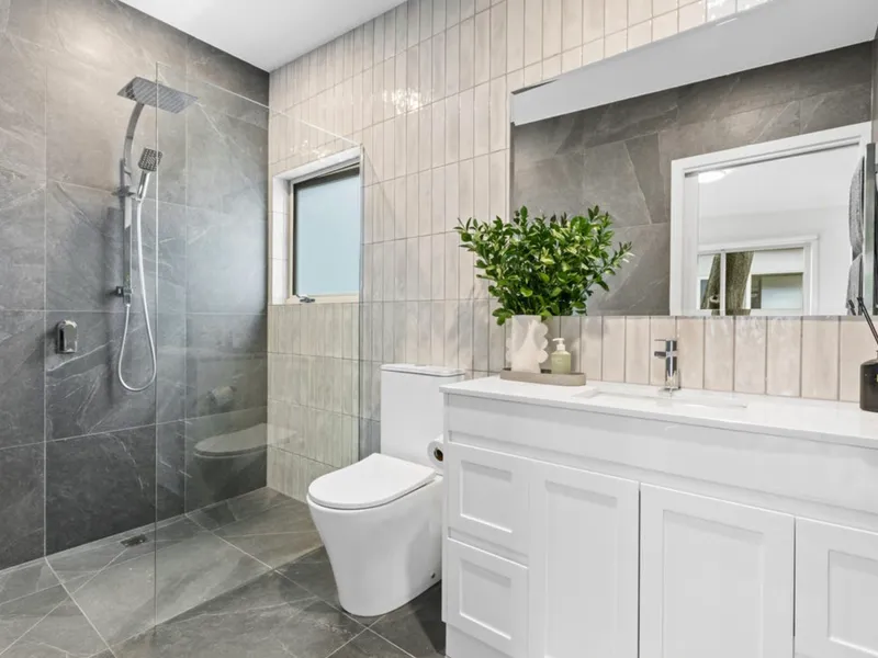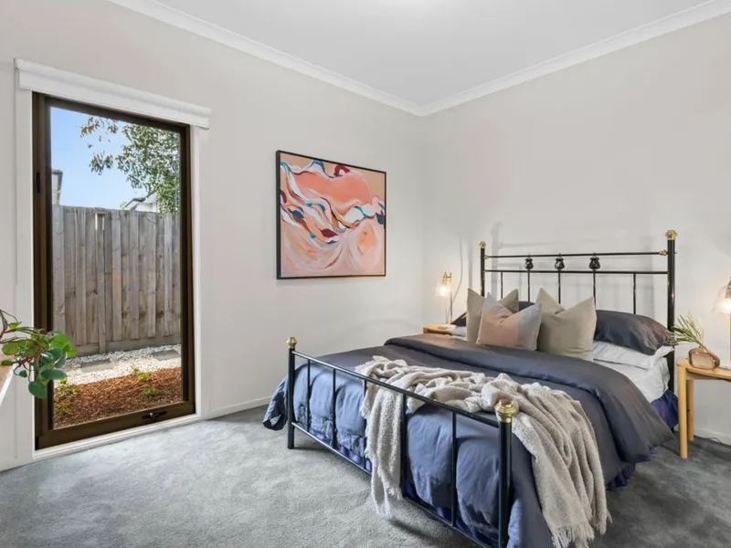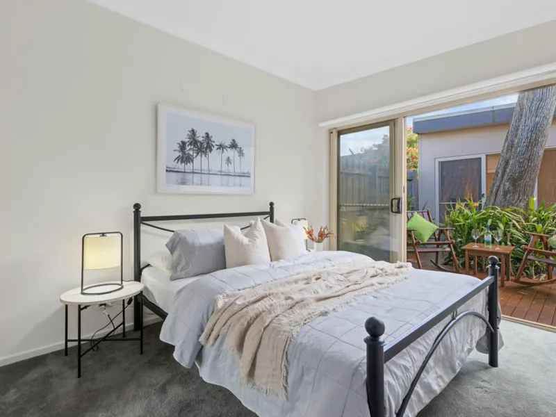 The main bedroom offers a calm retreat complete with fitted wardrobes and a contemporary ensuite. A second double bedroom with built-in robes enjoys access to an atrium-style deck that welcomes fresh breezes and natural light. A versatile third bedroom adds flexibility for families, guests or a home office.