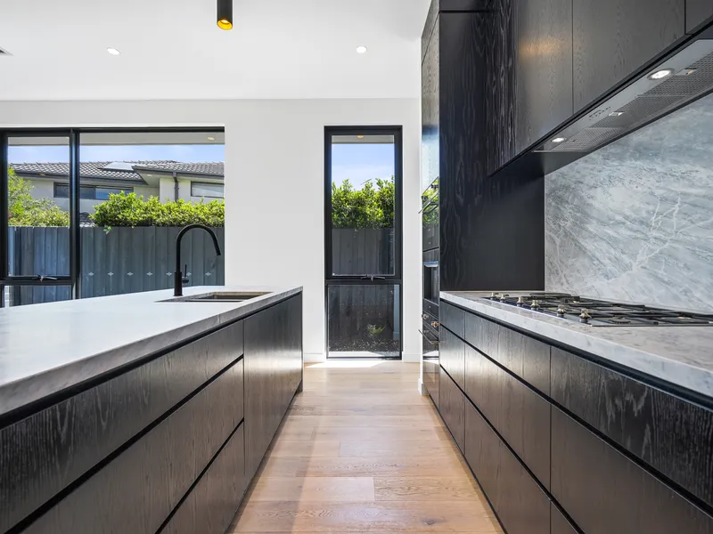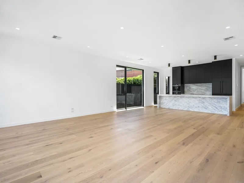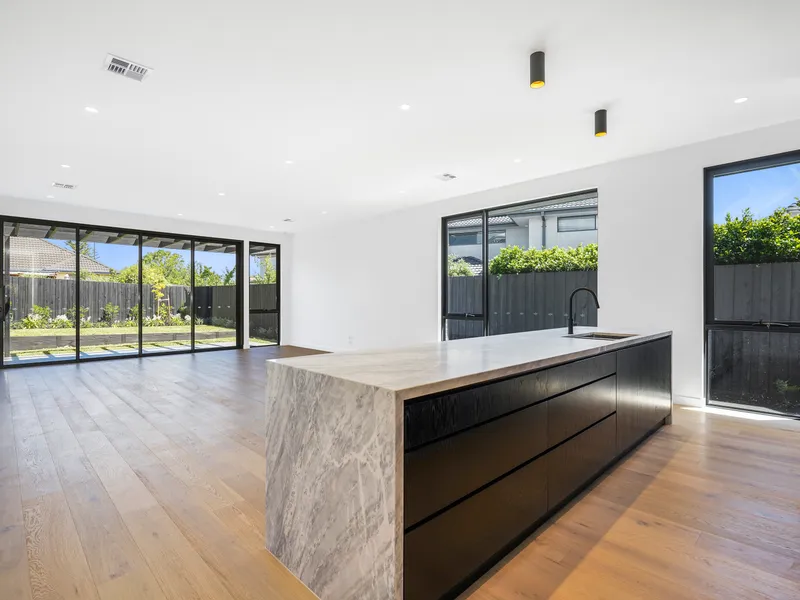• Light filled open kitchen/meals/living area with marble bench top
